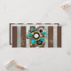 Relógio antigo e patenteado, adornado com joias, mãos de ouro e algarismos latinos com rosa de turquesa sobre fundo castanho e listrado. Estilo Steampunk.