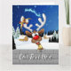 Um divertido cervo de desenho animado com um nariz vermelho brilhante e grandes chifres brancos, adornado com um laço vermelho e dourado, espreita por uma janela aberta. Do lado de fora, uma paisagem nevada com silhuetas de pinheiros e uma pequena casa iluminada é visível sob um céu noturno azul escuro cheio de estrelas. O trenó do Papai Noel puxado por renas está voando ao longe. A cena evoca uma atmosfera festiva e caprichosa de Natal. Arte Vetorial Original Copyright BluedarkArt TheChameleonArt.