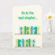 Este cartão de saudação apresenta uma linha de livros e a frase "On to the next Chapter..." escrita em verde em uma fonte divertida. Personalize o texto do dentro ou exclua para deixar o vazio. Excelente para professores de inglês, professores do ensino fundamental, diretores, etc.