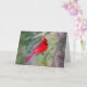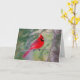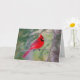 Cardinal do norte vermelho brilhante se destaca em cartão de saudação alegre. Ideal para todas as ocasiões. Em branco por dentro, fácil de personalizar para feriados ou mensagem especial.