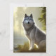 Um cartão de saudação plano para amantes da vida selvagem, com IA gerou pintura digital de um lindo lobo de madeira sentado perto de um riacho montanhoso.