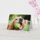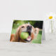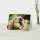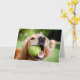 Uma foto de perto de um Retriever de Ouro com uma bola de tênis amarela na boca.
