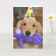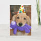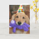 Brilhar o dia de alguém com este cartão de saudação fofo! Design apresenta um cão que recupera o ouro que veste um chapéu de festa feliz, e carregando um brinquedo roxo na boca. O texto personalizável do dentro diz: "Espero que seu aniversário seja maravilhoso."
