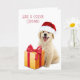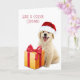 Um filhote bonito de ouro com um presente de Natal embrulhado em ouro e amarrado com um arco vermelho.