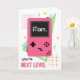 Cartão do Dia das Mães com tema dos anos 90, apresentando ilustração de um jogo de vídeo portátil rosa e gráficos inspirados nos anos noventa, incluindo estrelas e raios. O texto diz, "Mãe, você é de outro nível"