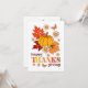 Cartão de saudação colorida com estilo de ranhura retrorreflector. A tipografia retrô elegante "Feliz Dia de Ação de Graças", com flores bonitinhas, borboletas, folhas de outono e abóbora. O cartão contém uma mensagem de boas-vindas maravilhosa no verso, que pode ser personalizada.