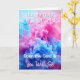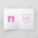 Sexo bonito revela cartão para família e amigos. O que será? Um menino ou uma menina? Fumaça rosa ou azul na frente. Dentro é uma garota e pegadas rosa.