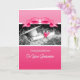 Um cartão de parabéns de graduação de cinza com uma fotografia a preto e branco de um boné de formatura e um diploma empinado com uma fita rosa contra um fundo rosa-quente.