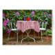 Rose bouquet em mesas de colheita e cadeiras no jardim de rododendron.