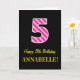 A frente deste simples e divertido design de cartões de saudação com tema de aniversário apresenta um grande número "5" com um padrão de rosa claro e cor-de-rosa escuro, juntamente com a mensagem "Feliz 5 de Aniversário", e um nome personalizável. O fundo da frente é preto colorido. O dentro apresenta uma mensagem de saudação de aniversário editável, ou talvez pudesse ser apagado e deixado o vazio se uma mensagem fosse escrita manualmente. Um cartão de aniversário personalizável como este pode ser uma maneira divertida de enviar uma mensagem em comemoração do quinto aniversário de alguém. [~Z0000377]