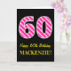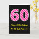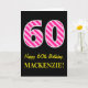 A frente desta divertida e simples design de cartões de saudação com tema de aniversário apresenta um grande número "60" com um padrão de cor-de-rosa escuro e listras de rosa claro, juntamente com a mensagem "Feliz 60º aniversário", e um nome personalizado. O fundo da frente é preto colorido. O dentro apresenta uma mensagem de saudação de aniversário personalizada, ou talvez possa ser apagado e deixado o vazio se uma mensagem for escrita manualmente. Um cartão de aniversário personalizável como este pode ser uma maneira divertida de enviar uma mensagem para celebrar o sexagésimo aniversário de alguém. [~Z0000377]