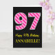 A frente deste simples e divertido design de cartões de saudação com tema de aniversário apresenta um grande número "97", com uma rosa claro e um padrão de listras cor-de-rosa-escuro. Também apresenta a mensagem "Feliz 97º aniversário", e um nome personalizável. O fundo da frente é preto colorido. O dentro apresenta uma mensagem de saudação de aniversário personalizável, ou talvez possa ser apagado e deixado o vazio se uma mensagem for escrita manualmente. Um cartão de aniversário personalizável como este pode ser uma maneira divertida de enviar desejos de aniversário a alguém que comemora seu 90° aniversário. [~Z0000377]