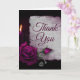 Um obrigado que você cumprimenta com um olhar gótico. Um velho papel-pergaminho cinza com pingos de vermelho roxo em volta das bordas. Um rosa magenta de cheio florescente, um rosebud, uma vela, e um cesto prateado em um fundo escuro de lama cria um belo e misterioso convite gótico.