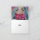 Pintura de uma mulher bonita com os rosas de cheiro do cabelo cinzento. Parada para cheirar os rosas. O interior do cartão lê "olá!!" em um carácter tipo moderno.