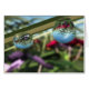 Um close-up gerado por computador 3D criou em Vue, focando-se em gotas de chuva brotando de uma lâmina de grama em um campo de flores. As primatas turvas, amarelas e lavandas no fundo refletem-se claramente nas gotas de água.