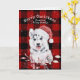 Cachorro rouco com chapéu de Papai Noel de Natal em flocos de neve na xadrez de búfalo vermelha e preta. O texto pode ser editado ou excluído.