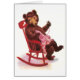 O urso de ursinho que senta-se em uma cadeira de balanço vermelha sews um vestuário para um de seus filhotes nesta ilustração do vintage de um livro de 1907 crianças.