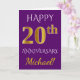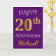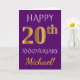 Este simples e personalizado design de cartão de saudação de aniversário de casamento apresenta a mensagem "FELIZ 20º ANIVERSÁRIO", com o "20º" tendo uma aparência semelhante ao ouro. A frente também apresenta um nome personalizado e um fundo roxo. O interior apresenta uma mensagem de saudação de aniversário de casamento personalizada. Poderia ser dado a um marido ou uma esposa em celebração do vigésimo aniversário de casamento do casal.