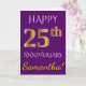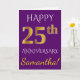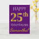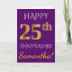 Este simples e personalizado design de cartão de felicitações de aniversário de casamento apresenta a mensagem "FELIZ 25º ANIVERSÁRIO", com o "25º" tendo uma aparência semelhante a ouro. A frente também apresenta um nome personalizado e um fundo roxo. O interior apresenta uma mensagem de felicitações de aniversário de casamento personalizável. Pode ser dado a um marido ou uma esposa em celebração do vigésimo quinto aniversário de casamento do casal.