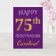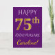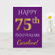 Este simples design de cartão de aniversário de casamento personalizado apresenta a mensagem "FELIZ ANIVERSÁRIO DE 75 ANOS", com o "75" tendo uma aparência semelhante ao dourado. A frente também apresenta um nome personalizado e um fundo roxo. O interior apresenta uma mensagem de aniversário de casamento personalizável. Pode ser dado a um marido ou esposa em celebração dos setenta e cinco anos de casamento do casal. [~Z0000089]
