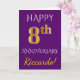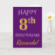 Este simples design de cartão de aniversário de casamento personalizado apresenta a mensagem "FELIZ 8º ANIVERSÁRIO", com o "8º" tendo uma aparência semelhante ao ouro falso. A frente também apresenta um nome personalizado e um fundo roxo. O interior apresenta uma mensagem de aniversário de casamento personalizada. Pode ser dado a um marido ou esposa em celebração do oitavo aniversário de casamento do casal. [~Z0000089]