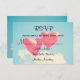 Um RSVP com 2 balões vermelhos brilhantes em forma de coração flutuando para cima no céu azul com algumas nuvens brancas fluffy atrás dos animados balões românticos.