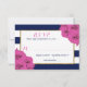 A coleção de casamento moderna de luxo apresenta um clássico fundo azul-marinho e faixa branca, acentuado com lindas rosas cor-de-rosa e uma falso estrutura de folha de ouro. Essas cartas de RSVP são fáceis de personalizar e serão o cartão de resposta perfeito para qualquer casamento, chá de panela, festa de aniversário, celebração de noivados ou qualquer outra ocasião especial.