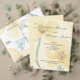 Esta cor-de-água amarela e azul-clara é um tema romântico e na moda para o seu papel de carta de casamento e suprimentos de festas. As flores amarelas e azuis das aquarelas são macios e elegantes. Este cartão de resposta RSVP pode ser adicionado aos convites acrílicos e de vellum, fornecendo as informações adicionais que não serão ajustados nesses convites unilaterais. Faz parte de uma série de papéis de carta de casamento e acessórios de festas e o fornecedor irá coordenar com este fazer de convite que os seus preparativos são fáceis.
