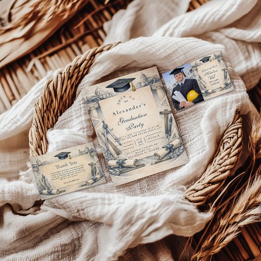 A refined architecture-inspired graduation design featuring classic blueprints, drafting tools, and elegant architectural details. The parchment-style layout paired with rulers, compasses, and scroll accents creates a timeless academic look, perfect for celebrating an architecture graduate’s achievement. Ideal for architecture students, future architects, and graduation celebrations with a sophisticated, professional aesthetic.