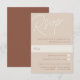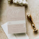 Projetada para corresponder aos nossos convites de casamento de Marcas d'água do Script, esta elegante placa RSVP baseada em tipografia é perfeita para RSVPs de entrada tradicional. O design apresenta uma inscrição de script sobredimensionada no topo, em tons em tons de tons para um efeito de marca d'água. Personalize com a data de RSVP desejada e aceite e recuse a redação em caracteres de serif clássicos alinhados à direita inferior, juntamente com opções de refeições ou seleções de entradas. A nossa Mancha de Areia é uma mistura elegante de tons de terra, com natas pálidas e letras de argila terracota em um fundo bege suave.