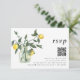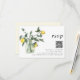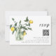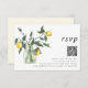 Esses cartões de resposta de RSVP de casamento deslumbrantes apresentam um arranjo de verdejante folhagem de limão em aquarela em uma jarra, em cores amarelas e verdes. Um visual floral de limões de verão elegante em um fundo branco simples, com tipografia moderna e espiralada. O cartão de RSVP combina um código QR na frente, bem como um cartão de RSVP tradicional no verso para os convidados que preferem devolver seus cartões pelo correio.