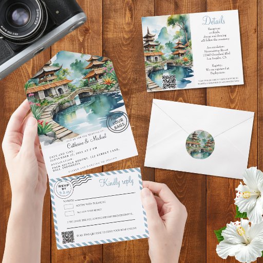 This elegant RSVP card features a tranquil watercolor illustration inspired by a bali indonesia destination wedding, showcasing graceful temple rooftops, lush tropical greenery, and a peaceful reflecting pond crossed by a charming stone bridge. The artwork evokes the atmosphere of an asian garden scenic paradise wedding, creating a beautiful first impression that reflects the romance and serenity of an island celebration.