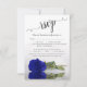 Esta bela placa RSVP apresenta um design simples, mas elegante, com um solteiro azul real ou rosa de cor cobalto, de longo, refletindo em uma piscina de água com ondulações e ondas. O título está escrito em uma caligrafia antiga e há espaço para seus hóspedes indicarem o número total de participantes e a escolha da refeição.