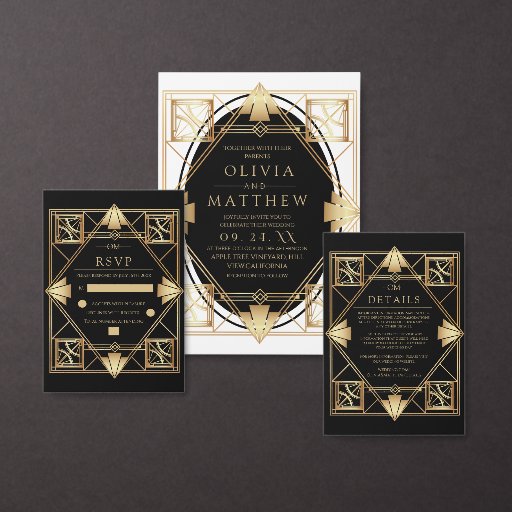 Black & Gold Art Deco Geometric Wedding RSVP Card