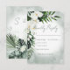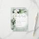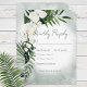 Este design de carta de resposta do casamento apresenta um belo verde-trópico e florais brancos em um fundo de cor aquosa verde-suave. Perfeito para o casamento de destino ou praia. Criado pela imprensa simplesmente de farmácia.