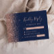 A borda esquerda desta elegante placa de caixa RSVP de casamento moderna apresenta uma borda falsa rosa dourada. O texto personalizável combina a escrita manual rosa-rosa-rosa pálida, as fontes em copperplate e itálico num fundo azul-marinho. O verso apresenta um design marinho azul e rosa dourado correspondente.