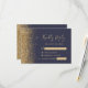 A borda esquerda desta elegante placa de caixa RSVP de casamento moderna apresenta uma borda falsa dourada. O texto personalizável combina manuscrito colorido de ouro pálido, fontes copperplate e itálico em um fundo azul escuro. O verso apresenta um design marinho azul e dourado correspondente.