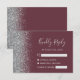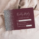 A borda esquerda desta elegante placa de caixa RSVP de casamento moderna apresenta uma borda cintilante de falso prateado. O texto personalizável combina a escrita manual de cinzas prateadas, fontes em copperplate e itálico em um fundo burgundy. O lado inverso apresenta uma burgundy e uma design prateada correspondentes.