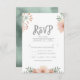 Um belo cartão RSVP com uma fonte decorativa única e delicados sotaques florais em pastéis moles, de cor-de-rosa pincelado a coral pálido. O reverso tem um fundo de aquarela impressionante em tons de verde-sábio correspondentes. Estes cartões tropicais são perfeitos para o verão, praia e casamentos tropicais, aniversários e outros eventos. Procure ID654 para ver outros produtos neste design de casamento.