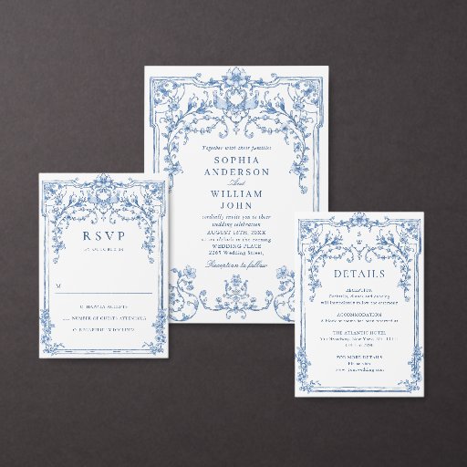 Na moda, fácil de usar modelos de casamento, mais itens (convites, rsvp, cartas de agradecimento, papelaria e decoração) com o mesmo design estão disponíveis na loja. Para mais personalização, clique em "Personalizar este modelo" e, em seguida, em "Editar usando a Ferramenta Design". Cartão RSVP de Casamento Floral de Jardim Francês Azul Elegante Vintage.