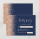 A borda esquerda desta elegante placa de caixa RSVP de casamento moderna apresenta uma borda falsa de pêssego. O texto personalizável combina a letra pálida de pêssego e as fontes de impressão em um fundo azul marinho. O verso apresenta um design azul-marinho e brilhante de pêssego correspondentes.