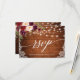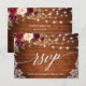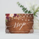 Cartão de RSVP de Renda Floral Marsala Burgundy Aquarela com Madeira Rústica, Letra de Caligrafia Moderna e Rosas Burgundy e Rosa. Luzes de Corda Iluminadas.