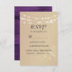 Cartão RSVP de casamento rosa de ouro moderno e elegante com luzes de cordas, rendas florais douradas e madeira roxa rústica para trás.