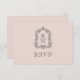 Esta elegante placa RSVP de casamento apresenta um par de iniciais de monograma de cinza de carvão cardíaco moldadas por uma crista de coroa de folha de acanto em um fundo cor-de-rosa pincelado. O texto combina fontes de sans serif e sans clássicas abertas.