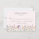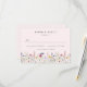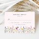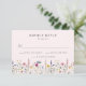 Cartões RSVP de casamento floral elegantes com data de resposta desejada e aceita/declina a redação com um fundo cor-de-rosa pincelado. Uma borda de flores silvestres e folhagem de cor d'água em tons de rosa, amarelo, roxo, azul e verde é exibida na parte inferior do design. Os cartões RSVP de casamento de flor silvestre russa são perfeitos para casamentos de primavera e verão.