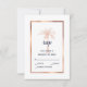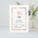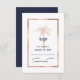 Forneça aos seus convidados para responder ao seu convite de casamento com esta elegante placa RSVP com o roteiro moderno e o texto azul marinho, incluindo uma palmeira artística e um quadro metálico de cobre de ouro rosa na frente da placa. Um fundo azul de marinho coordenado está atrás.