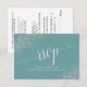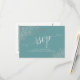 Essas lindas cartas de RSVP facilitarão para seus convidados responder ao seu convite de casamento. Eles apresentam um elegante design com caligrafia de guião em fundo de cor lacrimejante ou turquesa, e cinzas florais de prata herdada e espirais nos cantos. A parte de trás do cartão é um formulário para os convidados preencherem e retornarem indicando se podem ir ou não, o número de convidados que estão trazendo, e a escolha das refeições. Também há espaço para um site para que seus convidados possam responder online se for mais conveniente para eles.