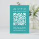 Um simples RSVP de Casamentos de Teal com um grande código QR no centro e o título escrito em caligrafia. Todo texto é branco. É vertical, orientado para retratos.