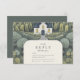 Um cartão RSVP encantador desenhado com uma cena de floresta de livros de histórias e uma capela branca esticada em verde-luxuoso. Esse tema romântico e encantador do campo é ideal para casamentos inspirados em conto de fadas com um cenário mágico e repleto de natureza.