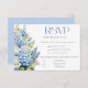 Design de casamento floral elegante com arranjos florais pintados a aquarelas de flores azuis de hydrangea, verde e rosas brancas.